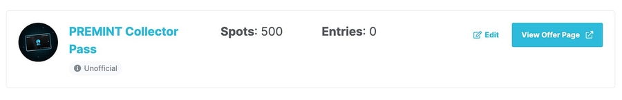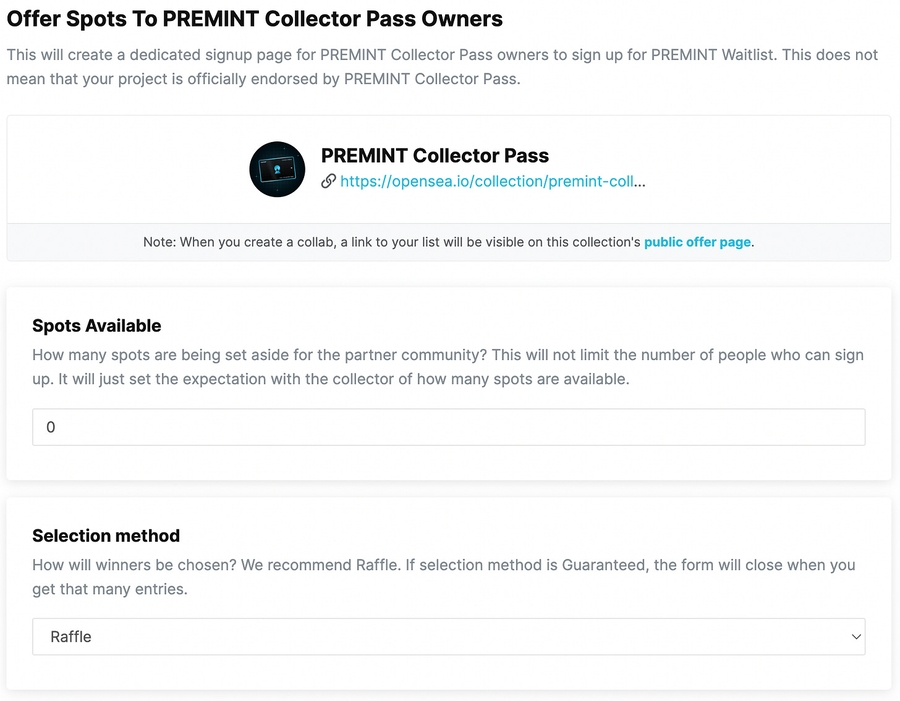 Remember, the PREMINT Collector Pass community is very active, and over 7.5k+ unique holders, so it’s best to offer at least 500 spots. We generally don’t accept super low spot allocations because it frustrates the community.